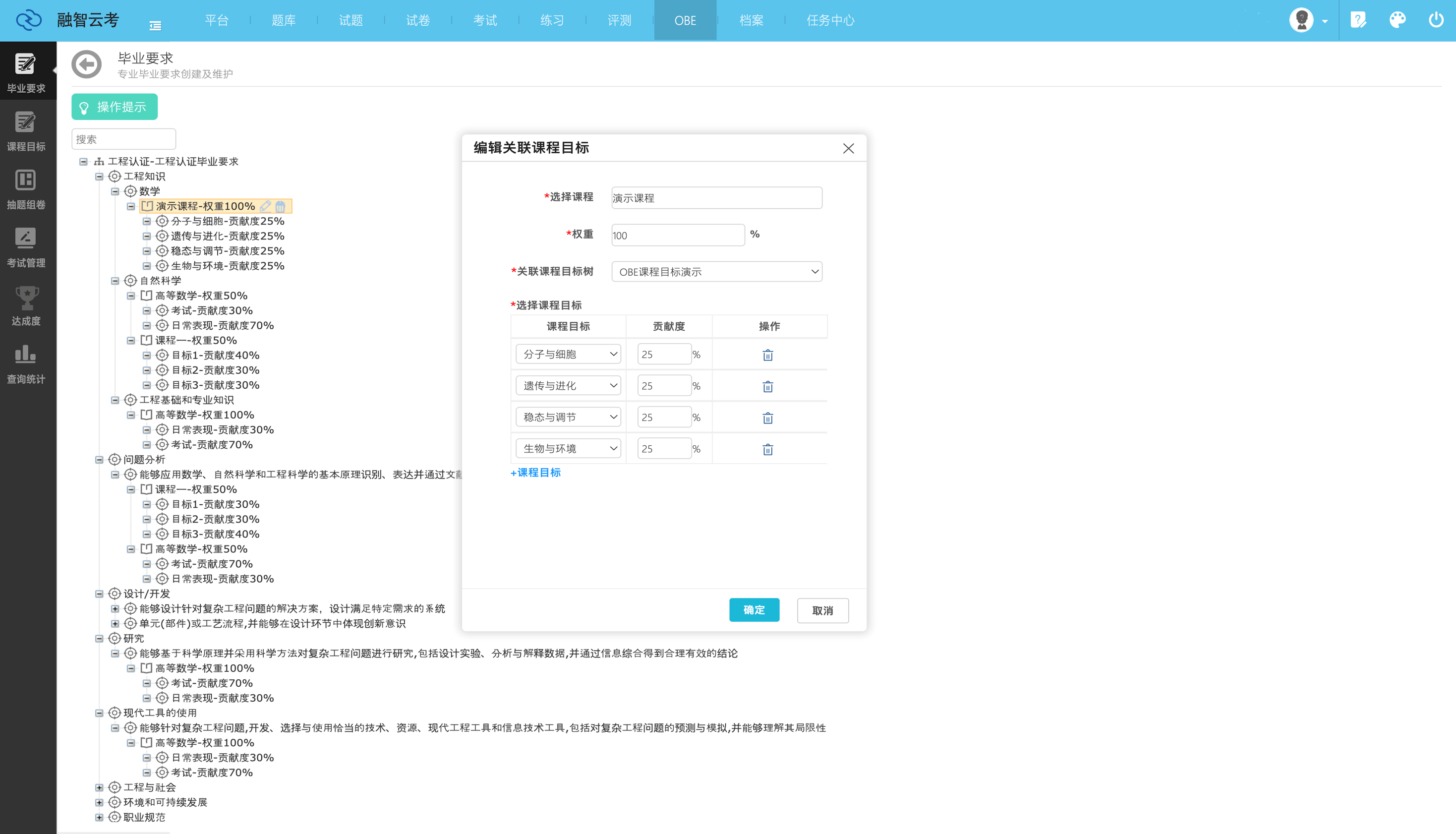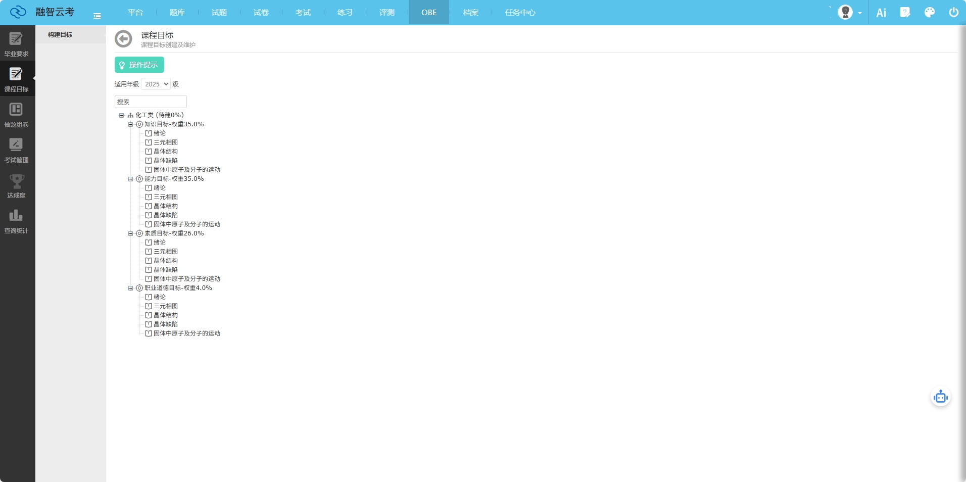 OBE讲授以“学生核心、导向、持续改良”为焦点,强调通过明白预期进修,反向设想课程系统取讲授方式。这一取我国工程教育认证尺度高度契合,已成为高校专业扶植的主要指南。融智云创软件无限公司的OBE处理方案笼盖了从专业扶植规划到课程方针告竣度阐发的全链条,通过数据驱动的体例帮帮高校实现讲授质量的可视化办理取动态优化。