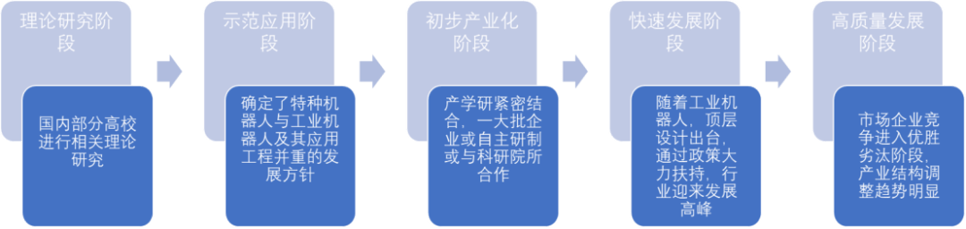 我国的工业机械人研究起头于20世纪70年代,大体可分为5个阶段,即理论研究阶段、示范使用阶段、初步财产化阶段、高质量成长阶段。