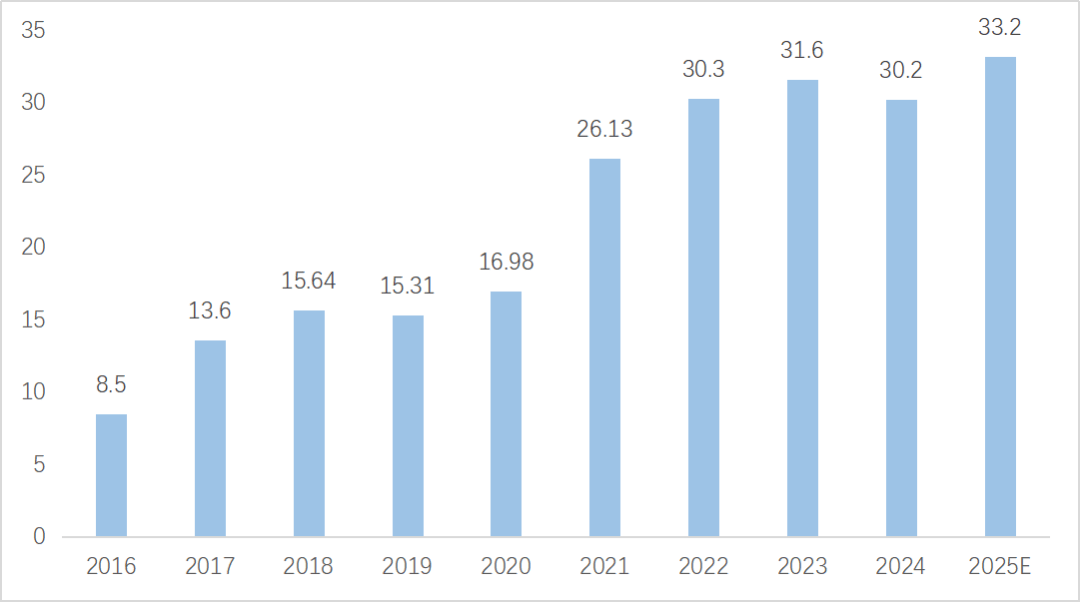 2016年以来,我国工业机械人销量全体呈现波动上升趋向,2016年销量为8。5万台,2024年销量增至30。2万台,复合增加率为17。2%。中国做为全球最大工业机械人产销市场的地位持续巩固。估计2025年,中国工业机械人市场销量无望达到32。5万台,同比增速约7。7%。