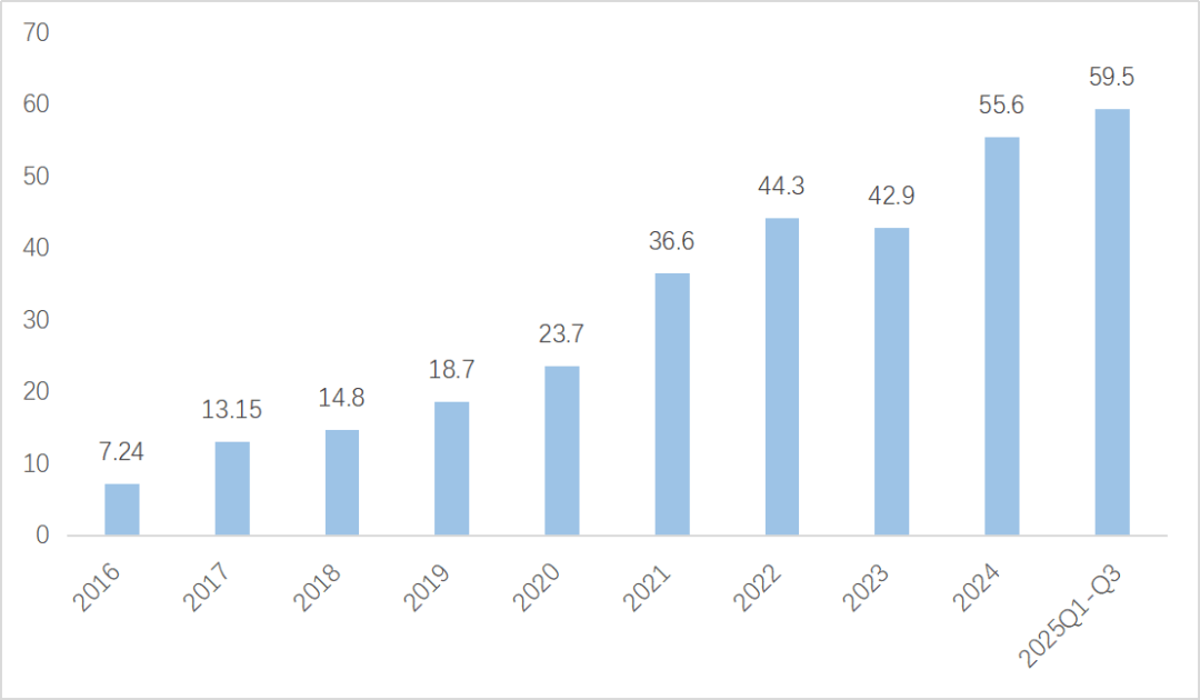 正在制制业智能化升级的需求拉动,以及上逛焦点零部件国产化率逐步提拔的布景下,我国工业机械人产量持续连结增加态势。2016年中国工业机械人产量为7。24万台,到2024年增至55。6万台,年均复合增加率跨越20%。2025年以来,我国工业机械人财产延续强劲成长态势,前三季度全国总产量已达59。5万套,跨越客岁全年总量,国产化率实现逾越式提拔。