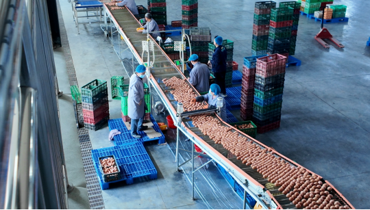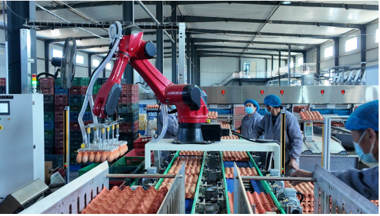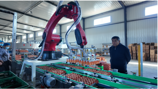 红色机械臂轻巧伸缩,60枚鸡蛋被精准吸起后稳稳放入蛋托,全程无一丝磕碰走进济南长田实业无限公司旗下易丰农业蛋鸡养殖场的分拣车间,面前的场景让人仿佛置身高端制制业车间。但细心察看便会发觉,传送带上滚动的是新颖鸡蛋这不是工业流水线,而是一家农业企业的智能出产现场。